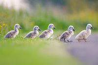 jonge zwaantjes staan op het punt om een straat over te steken.