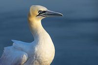 jong portret van de jan-van-gent (Morus bassanus), de zeevogels leven op de rotsen van het eiland Helgoland in de Noordzee, Duitsland, blauw water; kopieerruimte