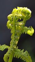 Fris groene kleur van een jong varen blad wat uitloopt close up, in opkomende zon in mijn achtertuin deze lente