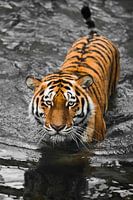. jonge mooie tijger met expressieve ogen loopt op het water (baadt), contrasterende zwarte water rode wol