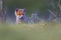 een jonge vos kijkt nieuwsgierig over een duinrandje