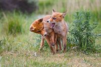 twee jongen vossen spelen in de duinen