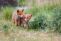 twee jonge vossen samen in de duinen