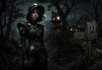 jonge vrouw in een griezelig bos, een verlicht gebouw op de achtergrond, griezelige spookachtige nacht, gothic, steampunk