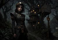 jonge vrouw in een griezelig bos, een verlicht gebouw op de achtergrond, griezelige spookachtige nacht, gothic, steampunk