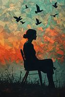 Een schilderij toont een jonge vrouw zittend op een eenvoudige stoel, omringd door zwarte vogels die rondom haar vliegen. Haar zachte, dromerige blik geeft het tafereel een serene sfeer, terwijl de vogels symbool staan voor vrijheid en harmonie. De delicate penseelstreken en zachte tinten brengen een gevoel van vrede en verbondenheid met de natuur over.