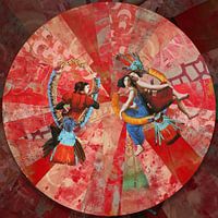 ronde collage met een achtergrond van straalsgewijs opgeplakte stroken gelliprints in overwegend rode tinten, met daarop afbeeldingen van vrolijk geklede vrouwen op schommels van kleurige veren
