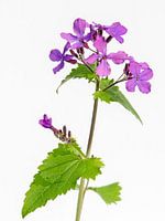 Lunaria annua is niet inheems in Nederland maar in veel tuinen te vinden. Het is een tweejarige plant met vrolijke paarse bloemen. In de herfst krijgt hij prachtige zilverwitte zaaddozen. De bloemt is buiten gefotografeerd tegen een witte achtergrond bij zonnig weer.
