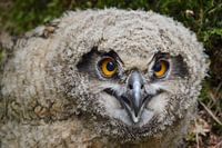 Eurasian Eagle Owl / Uhu ( Bubo bubo ) young chick, jumped out of nest, still unfledged, sitting on the ground, close up, head portrait, wildlife, Europe.