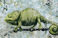 Deze groene kameleon loopt voorzichtig over een tak. Dit tropische kunstwerk is digitaal geschilderd in groen en blauwe tinten. Deze natuurlijke kleuren passen in een botanische interieur stijl.