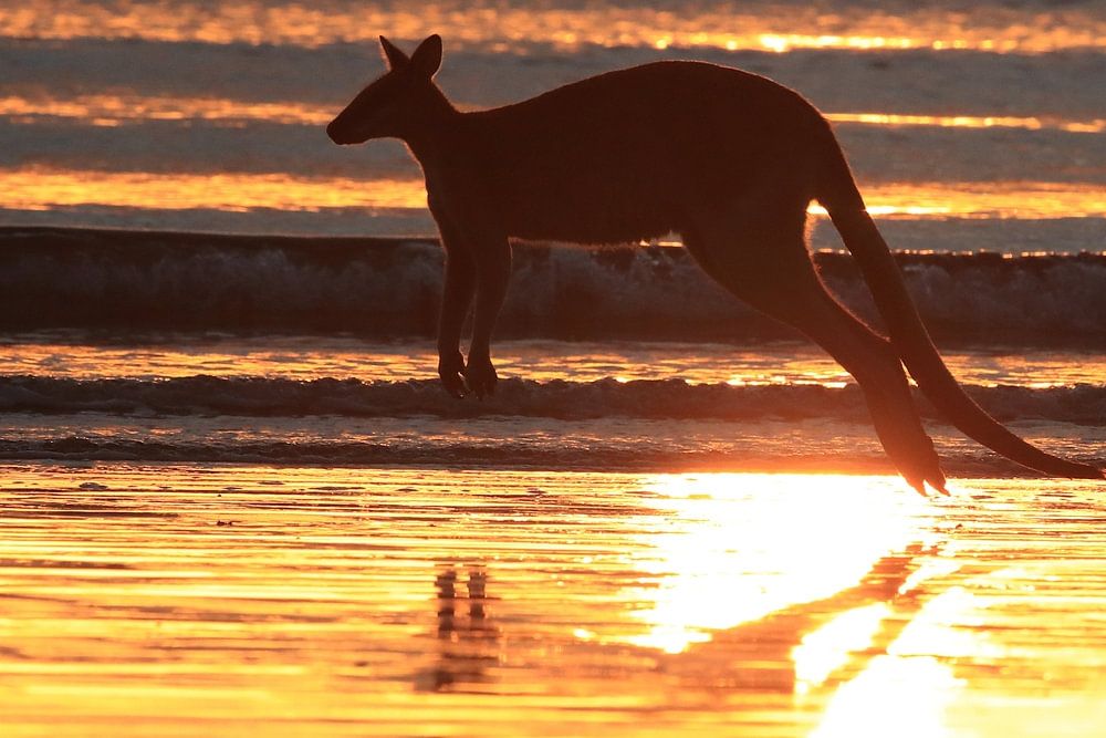 kangoeroe op strand bij zonsopgang, mackay, noord queenland, australië