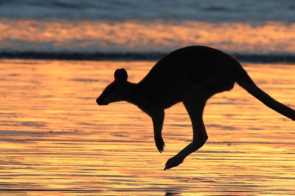kangoeroe op strand bij zonsopgang, mackay, noord queenland, australië