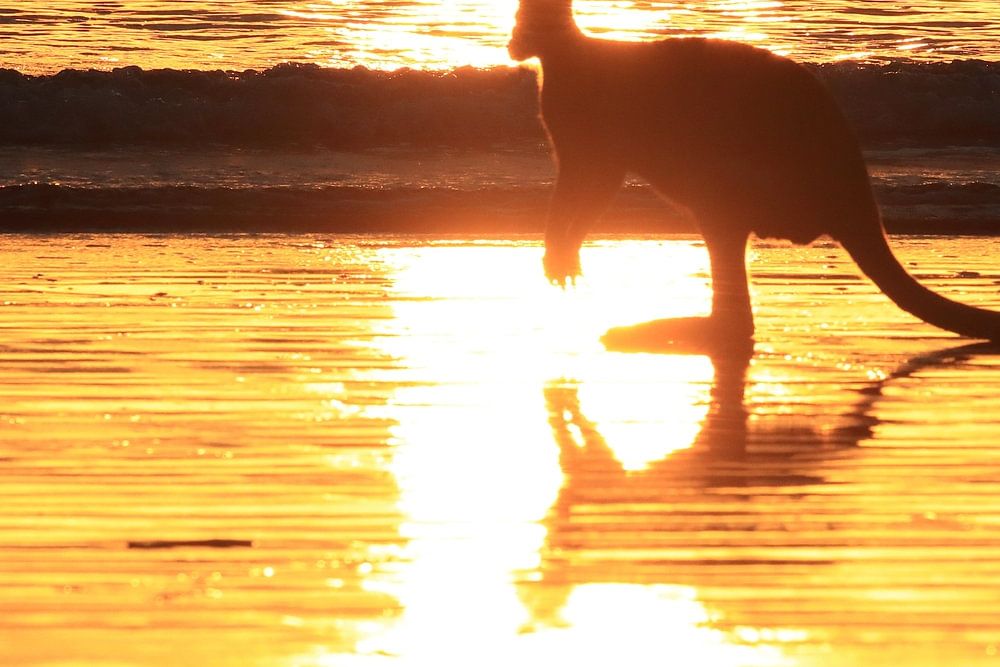 Koop de foto kangoeroe op strand bij zonsopgang, mackay, noord queenland, australië van Frank Fichtmüller op canvas, aluminium dibond, (ingelijste) fotoprint, behang en ArtFrame, op maat geprint in Fine-Art kwaliteit.