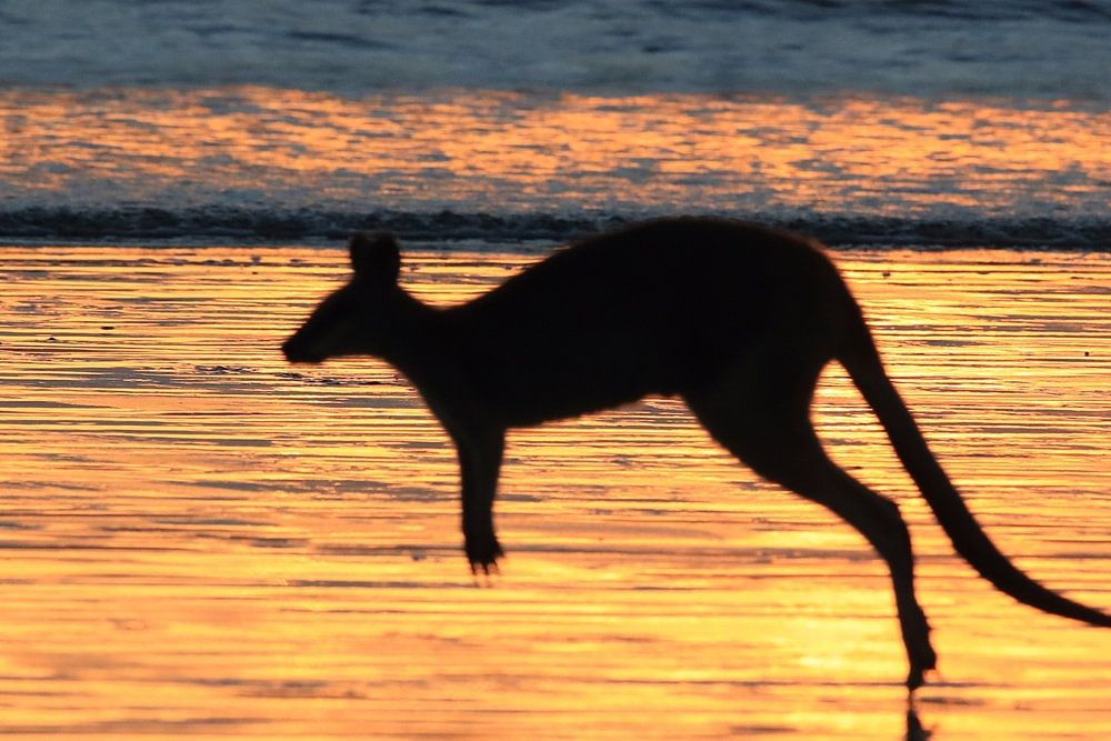 kangoeroe op strand bij zonsopgang, mackay, noord queenland, australië