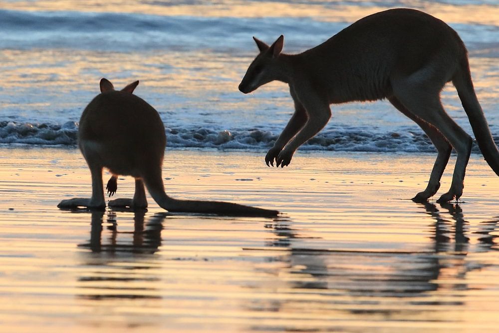 kangoeroe op strand bij zonsopgang, mackay, noord queenland, australië