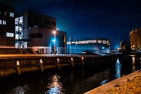 industriële afbeelding van een deel van de vissershaven van Scheveningen. Het kantoor van de havenmeester kijkt uit op de ingang van de haven. Vanwege de avondopname is een lange sluitertijd gebruikt en is er op een mooie manier gebruik gemaakt van het licht. De afbeelding is industrieel, waardoor de grovere korrel mooi tot zijn recht…
