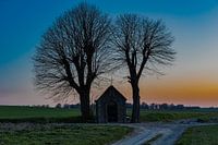 Typisch christelijk veldkapelletje midden in het weiland tijdens een kleurijke zonsondergang, nabij Maastricht. Deze katholieke kapellen tref je overal aan in het Limburgse heuvelland