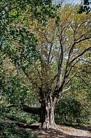 een machtige kastanjeboom midden tussen andere bomen. het blad is aangetast door ziekte of insecten wat de boom een speciaal uiterlijk geeft. dit is versterkt door lichte digitale bewerking.,
