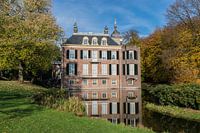 fantastische mooie omgeving in Arnhem, Kasteel Zijpendaal in herfstkleuren omgeven. Heerlijk bos in de herfst, mooie blauwe lucht op een zonnige nazomerdag. Reflecterend in het kleine water voor het slot.