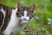 Kat met een gevangen muis in zijn mond.