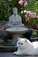 witte kat poseert met boeddha en drinkschaal