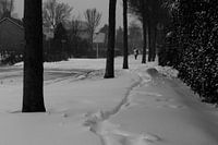 In de sneeuw. paraplu op en gaan. alleen maar vooruit. Ameland waddeneiland. sneeuwstorm.