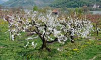 Wit bloeiende kersenboom in het Donau-dal in het voorjaar in de Wachau, Oostenrijk.