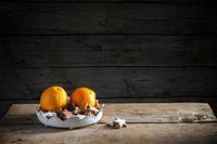 Koop dit stilleven kerstkoekjes en sinaasappels in een kom op een rustieke tafel, donkere houten achtergrond met een gr van Maren Winter op canvas, aluminium dibond, (ingelijste) fotoprint, behang en ArtFrame, op maat geprint in Fine-Art kwaliteit.