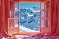 zicht vanuit een huis of kamer door de ramen of deuren op een prachtig besneeuwd berglandschap gezien op vakantieadres in binnen of buitenland. Room with a view.