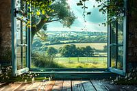uitzicht vanaf mijn vakantieadres op een prachtig wijds landschap wat een kalmerende invloed op mij heeft en me een gevoel van vrijheid en rust geeft. AI bewerking