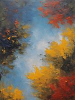 Wanneer je in het bos loopt tijdens de herfstperiode en naar boven kijkt zie je de toppen van de bomen en de rustgevende wolken. Dit heb ik beoogd met deze mooie abstracte schilderij. Een element van rust voor in je woonkamer.