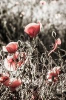 De felrode bloemen van de maïspapaver, wild in Midden-Europa, bloeien vanaf eind mei en markeren het begin van de vroege zomer. Een idyllische vintage foto met kleurrijk geaccentueerde bloemen.