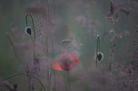 klaproos met knoppen in een veld met veel grassen die de foto een mystiek karakter geven. Bewuste onscherpte met zachte kleuren, pastel tinten. Terheijden, Noord-Brabant, Holland, Nederland, Nederlands Landschap. Er is een pallet van pastelkleuren ontstaan door de vele grassoorten die zich voor en achter de klaproos bevinden. Er is gekozen voor hel laagst mogelijke standpunt om het kleurenspel tot zijn recht te laten komen. De foto is genomen in tegenlicht van de ondergaande zon. De kleurbalans is automatisch om een zo neutraal mogelijk kleuren pallet te krijgen. De ondergaande zon geeft in de zomer zachte kleuren. De klaproos is scherp en verborgen in het gras. De foto blijft trekken door een grote hoeveelheid mystiek door de onscherpe elementen en pastelkleuren. Het oog wordt getrokken door de kleur rood. De spanning ontstaat doordat de klaproos niet prominent in beeld is. Verborgen elementen versterkten de mystiek. De knoppen van de klaproos staan evenwichtig links en rechts in beeld om lijn te brengen in het beeldpatroon. Een collega zou het liefs een foto van Pamela Anderson zien, daar voor moet je bij deze foto wel erg veel fantasie hebben. afbeelding klaproos afbeelding bloemen afbeelding gras
