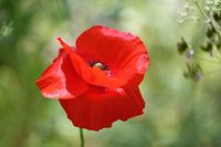 Een klaproosje in bloei tegen een zachte groene achtergrond.