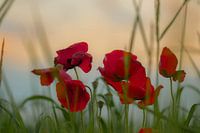 close up van een groepje klaprozen tussen het gras, met op de achtergrond de oranje lucht door de opkomende zon