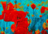 Digitaal bewerkte foto's van papaverbloesems en papavervelden in rood en turkoois.