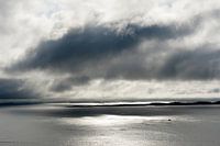 een vissersbootje op zee lijkt door de afstand een speelgoedboot op een enorme watermassa. dreigende wolken lijken nog donkerder door het tegenlicht en bijna zwart wit