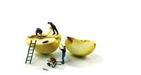 kleine figuren bezig met het verwijderen van de zaden van de appel geïsoleerd op een witte achtergrond