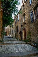 Typisch smal straatje in de middeleeuwse oude binnenstad van Sarlat la Caneda, Perigord, Frankrijk met trappen en niveaus