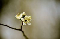 macro shot van een kleine witte bloesem met gele meeldraden, met een grijze achtergrond