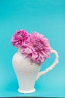 twee roze dahlia's in een ouderwetse witte buikvaas op een blauwe achtergrond