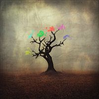 Boom die wolken van verschillende kleuren draagt. Surrealistisch digitaal getekende foto / collage