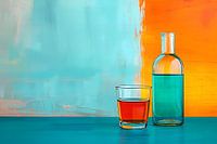Het abstracte schilderij toont een dynamisch patroon van wijn- en whiskeyglazen, gecombineerd met flessen in verschillende vormen en maten. De glazen en flessen zijn gestileerd en overlappen elkaar, waardoor een gevoel van diepte en beweging ontstaat. Vormen vloeien samen in een speelse dans van lijnen en kleuren, variërend van diepe amber- en wijnrood tinten tot helder kristal en goud. Sommige glazen zijn half gevuld, andere leeg, met druppels en spatten die losjes over het canvas zijn verspreid. Dit levendige en expressieve kunstwerk vangt de essence van feestelijkheid en gezelligheid, terwijl de abstracte compositie uitnodigt tot interpretatie en verbeelding.
