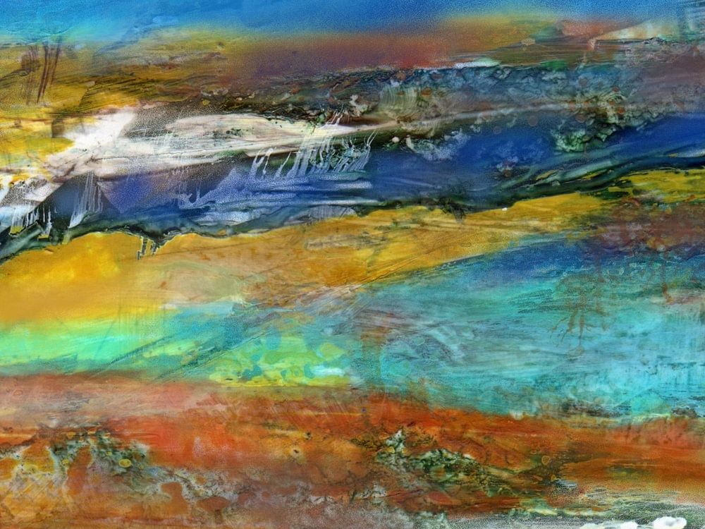 Over ‘kleurrijk landschap met turkoois en blauw’ van Claudia Gründler