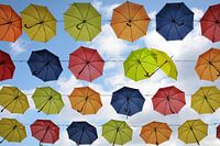 kleurrijke hangende paraplu's in de lucht, twee zijn flirten, straatdecoratie achtergrond