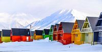 Longyearbyen Spitsbergen kleurige huisjes in het stadje nog vroeg in het voorjaar dus met besneeuwde bergen op de achtergrond. Tijdens een reis naar dit arctische gebied.