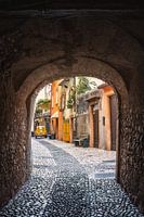Dit beeld laat een steegje in Malcesine zien, een sfeervol stadje aan het Gardameer. Je kijkt vanuit een donkere doorgang naar een geplaveide straat die baadt in het zonlicht. De straat kronkelt tussen oude gebouwen met verweerde muren in warme tinten als terracotta en zandkleurig beige.