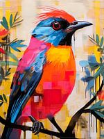 In het levendige schilderij komt een kleurrijke vogel tot leven met een spectrum van schitterende tinten. Zijn verenkleed is doordrenkt met een overvloed aan kleuren - kobaltblauw, zonnig geel, diep groen en levendig rood dansen samen in harmonie. Elke veer lijkt met zorg geschilderd, met oog voor detail en schakeringen die de vogel een bijna tastbare levendigheid geven. De vogel straalt een aura van speelse elegantie uit, waarbij zijn kleurenpracht het bewijs is van de wonderlijke diversiteit van de natuur.