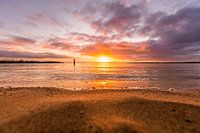 Een kleurrijke zonsondergang aan het strand. De zon gaat precies in het midden van de foto onder, wat de compositie compleet maakt. Deze foto zou uiteraard fantastisch tot zijn recht komen op geborsteld aluminium.