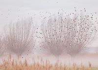 Mooie zachte afbeelding van knotwilgen in de mist. een zwerm van vogels ontwaakt uit de bomen en zoeken de vriijheid op. mist aan de grond, riet op de voorgrond. Nederlandser word het niet